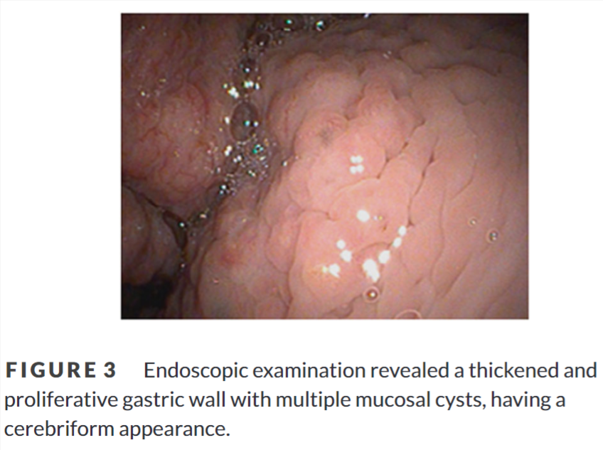 초음파 특성은 위와 같다. 보통 위벽의 비후가 일반적인 원인에 일어나는경우 muscularis가 비후되는 경우가 많은데 이 증례는 뚜렷한 점막의 비후 양상이 보이며, cyst가 보이는게 특징적이다.