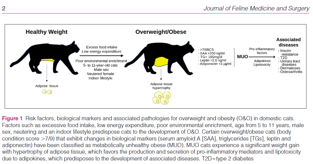 다시 말해 비만이 오게 되면, 지방세포의 크기가 증가되고, 염증을 유발하는 물질을 만들어 내면서 중력에 의해 관절에 충격이 가해졌을 때 비만하지 않는 고양이에 비해 더 심한 염증이 발생하며, 이로 인해 통증이 존재함으로 움직이기 싫어하고 더 비만하게 되는 악순환이 돌게 된다.