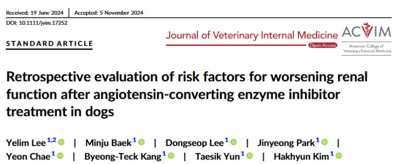 심장 질환이 있는 개에서 초기부터 사용되는 ACEi (Angiotensin-converting enzyme inhibitors)의 위험성에 대해 조사한 논문이 나왔다. 분당의 리더스 동물병원과 충북대학교에서 공동으로 작성한 논문이다.