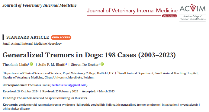 - 원인 질환: 개에서 전신 떨림을 유발하는 가장 흔한 질환은 중독(91/198, 46%)과 특발성 전신 떨림 증후군(IGTS)(49/198, 24.7%)이었다. 그 외 주요 원인으로는 저칼슘혈증(6.6%), 원인 불명 수막뇌척수염(MUO, 4.5%), 저혈당증(3%), 고칼슘혈증(2.5%), 퇴행성 뇌병증(2.5%) 등이 있었다. 중독의 경우, 원인 물질이 확인되지 않은 경우가 가장 많았고(36.3%), 진균독소(곰팡이 독소, 31.9%)와 메탈데하이드(달팽이 제거제 성분, 12.1%)가 뒤를 이었다.