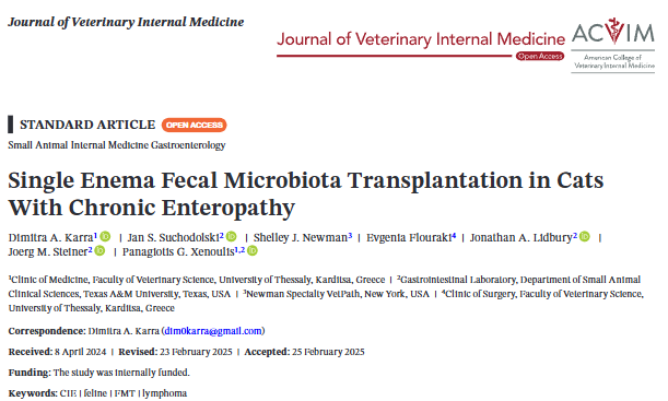 | 본 연구의 결과는 단회 관장 방식의 분변 미생물 이식이 고양이 만성 장병증 환자에서 장내 미생물 환경이나 임상 증상을 유의적으로 개선하는 데 충분하지 않을 수 있음을 나타낸다. 이는 사람 및 개를 대상으로 한 이전 연구들에서 다회 또는 반복적인 FMT 시술이 더 효과적일 수 있음을 시사하는 것과 맥락을 같이 한다. 본 연구는 제한된 수의 환자를 대상으로 하였고, 일부 환자에서 동반 질환 또는 추가적인 약물 치료가 이루어졌다는 점 등의 제한점을 가지고 있다. 따라서 다른 FMT 프로토콜을 사용하거나 더 많은 환자를 대상으로 하는 추가 연구를 통해 고양이 만성 장병증 치료에서 FMT의 효능을 보다 명확히 평가할 필요가 있다. 그럼에도 불구하고 본 연구에서 단회 FMT 시술과 관련하여 심각한 부작용은 관찰되지 않았으며, 위장관 증상 악화 또한 나타나지 않았다. |