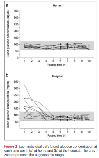 | 병원 방문으로 인한 스트레스는 고양이의 임상 및 실험실 결과에 영향을 미친다. 본 연구는 스트레스 유발성 고혈당증을 보이는 건강한 고양이의 경우 재평가 전 최소 6시간 동안 순응 기간을 가져야 함을 시사한다. 아픈 고양이에서의 유사 연구가 필요하다. 급성 스트레스는 본 연구에서 확인된 바와 같이 진단을 복잡하게 만들 수 있다. 심박수 증가, 호흡수 증가와 같은 신체 검사 소견 및 공격성 또는 숨기와 같은 행동 변화는 진단 과정을 더욱 어렵게 만든다. 스트레스는 또한 일시적 고혈당증 및 혈청 코르티솔, 담즙산 농도 증가를 포함한 실험실 검사 결과의 변화를 야기한다. 따라서 병원 방문 중 나타나는 이상 소견은 질병뿐만 아니라 스트레스에 기인할 수 있다. 병원 환경에서 고양이 스트레스의 기전을 이해하는 것은 중요하다. |