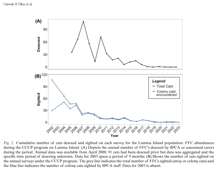 | 2000년부터 2024년 3월까지 라마 섬에서 총 553마리의 길고양이가 TNR을 통해 중성화되었다. 중성화된 고양이 수는 2007년에 109마리로 가장 많았으나, 2018년 이후에는 급격히 감소하여 2018년과 2020년에는 각각 1마리만 중성화되었다. 길고양이 개체 수 조사 결과에서도 초기에는 많은 수의 고양이가 관찰되었으나, 시간이 지남에 따라 2019년부터 2023년까지는 단 한 마리만 관찰되거나 전혀 관찰되지 않는 등 뚜렷한 감소 추세를 보였다. |