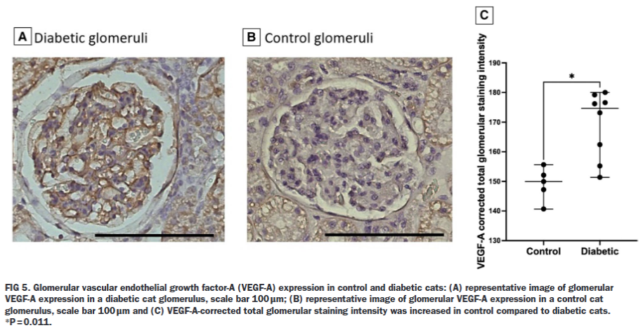 더 나아가 연구팀은 이러한 구조적 변화와 관련된 분자생물학적 요인을 탐색했다. 특히 혈관신생과 내피세포의 건강 유지에 핵심적인 역할을 하는 혈관내피성장인자-A(VEGF-A)에 주목했다. 흥미롭게도 VEGF-A는 부족해도 문제가 되지만, 과도하게 발현될 경우 오히려 내피세포 손상을 유발하는 양면성을 가진다. 사람의 초기 당뇨병성 신장병증에서는 사구체 내 VEGF-A 발현이 증가하는 것으로 알려져 있는데, 본 연구에서도 당뇨병 고양이 그룹의 사구체 내 VEGF-A 발현이 대조군에 비해 유의하게 증가한 것으로 확인되었다. 이는 고양이에서 관찰된 미세구조 변화가 사람의 당뇨병성 신장병증과 유사한 기전을 통해 발생할 수 있음을 시사하는 강력한 증거이다.