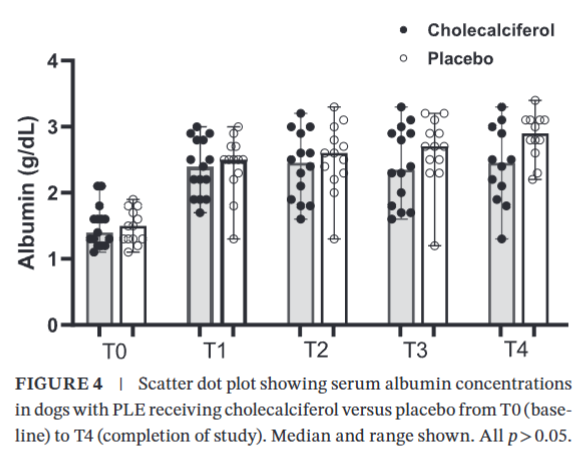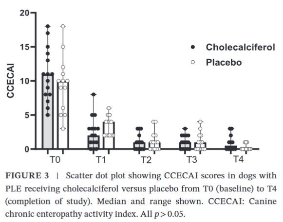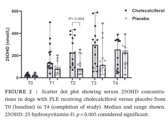 더욱 주목할 만한 사실은, 위약을 투여받은 그룹의 상당수 개들도 표준적인 장 질환 치료만을 받았음에도 불구하고 연구 기간 동안 비타민 D 수치가 정상 범위로 회복되는 경향을 보였다는 점이다. 이는 PLE에서 관찰되는 비타민 D 결핍이 질병의 임상 증상을 유발하거나 악화시키는 '원인'이라기보다는, 장 기능 손상 및 염증으로 인해 발생하는 '결과'일 수 있다는 가능성을 제기한다. 즉, 근본적인 장 질환이 성공적으로 치료되면 비타민 D 수치 역시 자연스럽게 개선될 수 있음을 보여준다.
