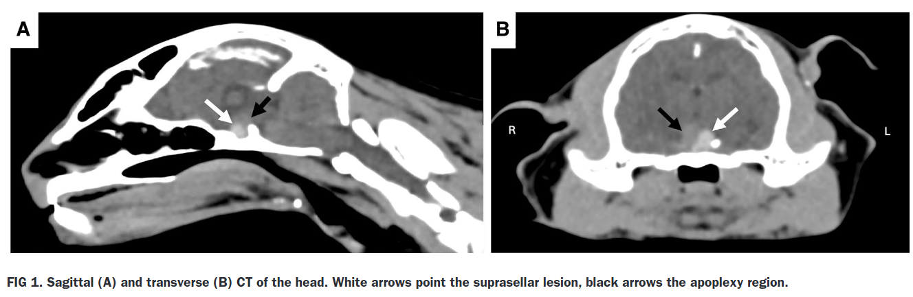 기존에 뇌하수체 종양이 존재하던 환자에게서 중풍이 발생하면 급격한 신경 증상 악화를 유발할 수 있으며, 이 증례처럼 예후가 좋지 않을 수 있음을 시사합니다. 따라서 임상 수의사는 유사한 증례를 접했을 때, CT 영상 소견을 바탕으로 신속하고 정확하게 잠정 진단을 내리고 보호자와 예후에 대해 상담하는 데 이 연구 결과를 활용할 수 있습니다.