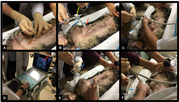 - 초음파로 신우를 관찰하면서 생리식염수를 조심스럽게 주입합니다. 신우에 작은 기포가 보여 생리식염수 주입이 확인되면, 과도한 팽창을 막기 위해 즉시 액체를 다시 빼냅니다.
