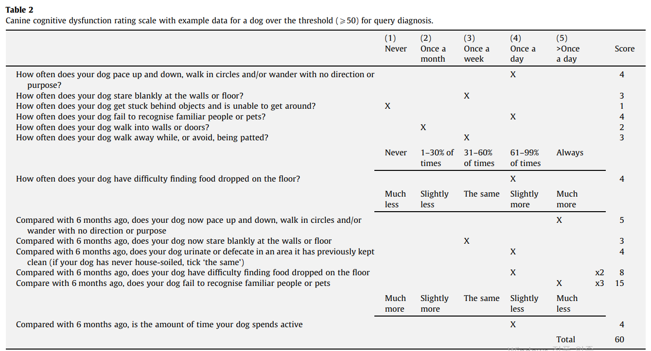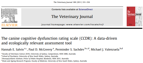 | Salvin HE, McGreevy PD, Sachdev PS, Valenzuela MJ. The canine cognitive dysfunction rating scale (CCDR): a data-driven and ecologically relevant assessment tool. Vet J. 2011 Jun;188(3):331-6. doi: 10.1016/j.tvjl.2010.05.014. Epub 2010 Jun 12. PMID: 20542455. |