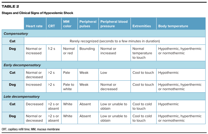 반려견과 고양이의 저혈량성 쇼크의 단계 및 임상 징후