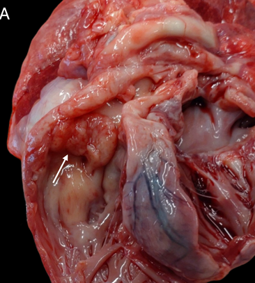 - 부검 소견: 부검을 통해 폐동맥 판막과 관련된 종괴가 우심실로 확장되어 우심실 및 우심방 심근을 침윤하고 있음을 확인하였고, 이로 인해 심한 유출로 및 판막성 폐동맥 협착증이 발생했음이 밝혀졌습니다. 또한, 흉수, 경미한 심낭 삼출액 및 복수도 확인되었습니다. 좌측 신장이 현저하게 불규칙하고 커져 있었으며, 췌장과 횡격막에서도 결절성 병변이 관찰되었습니다.