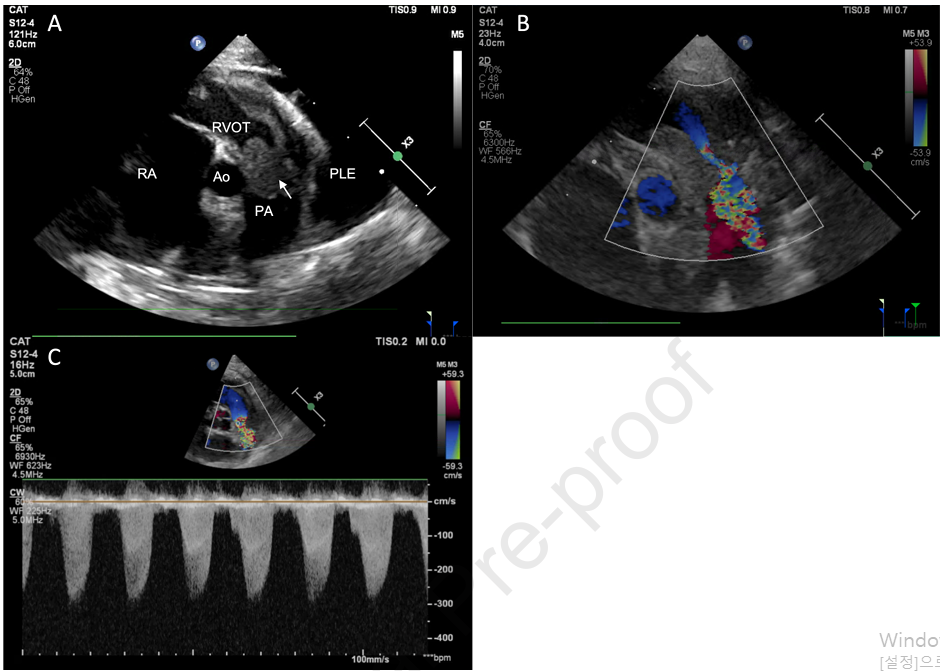 - 초음파 검사 소견: 경흉부 심장 초음파 검사에서 우심실 유출로에 광범위하고 균질한 종괴가 발견되었으며, 이는 폐동맥 판막을 침범하여 심한 유출로 및 판막성 폐동맥 협착증을 유발하였습니다. 이로 인해 우심방 및 우심실 확장이 관찰되었습니다. 또한, 심한 흉수와 미량의 심낭 삼출액, 간정맥 울혈 및 후대정맥 확장이 확인되어 우측 울혈성 심부전과 일치하였습니다.