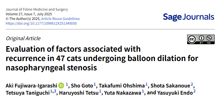 1. 연구 배경: 왜 이 연구가 필요했을까요?고양이 비인두 협착증(Nasopharyngeal stenosis, NPS)은 비인두가 비정상적으로 좁아지는 질환으로, 심한 호흡 곤란(협착음, 개구 호흡 등), 재채기, 비강 분비물 등 다양한 임상 증상을 유발합니다. 선천적 원인 또는 상부 호흡기 감염, 만성 비염 등 후천적 염증에 의해 발생할 수 있습니다.여러 치료법 중 풍선 확장술(Balloon Dilation, BD)은 최소 침습적인 방법으로 선호되지만, 시술 후 재발이 잦아 임상 증상이 일시적으로만 개선되는 경우가 많다는 한계점이 있었습니다. 이전 일부 보고에서 반복적인 시술이 장기적인 예후에 도움이 될 수 있다고 제안되었으나, 명확한 프로토콜은 정립되지 않은 상태였습니다. 따라서 본 연구는 풍선 확장술 후 임상 증상 재발에 영향을 미치는 요인들을 평가하고자 진행되었습니다. 2. 연구 방법: 어떻게 진행되었나요?이번 연구는 비인두 협착증으로 진단받고 풍선 확장술을 받은 고양이 47마리의 의료 기록을 분석한 후향적 다기관 연구로 진행되었습니다. 연구 대상 고양이들은 두 그룹으로 나뉘었습니다.