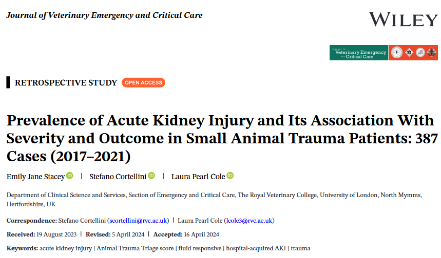 이번 연구는 이러한 지식의 공백을 메우기 위해, 개와 고양이 외상 환자에서 AKI의 유병률과 등급을 파악하고 , AKI가 외상 중증도, 입원 기간, 그리고 최종 예후와 어떤 연관성을 갖는지 규명하는 것을 목표로 진행되었습니다.