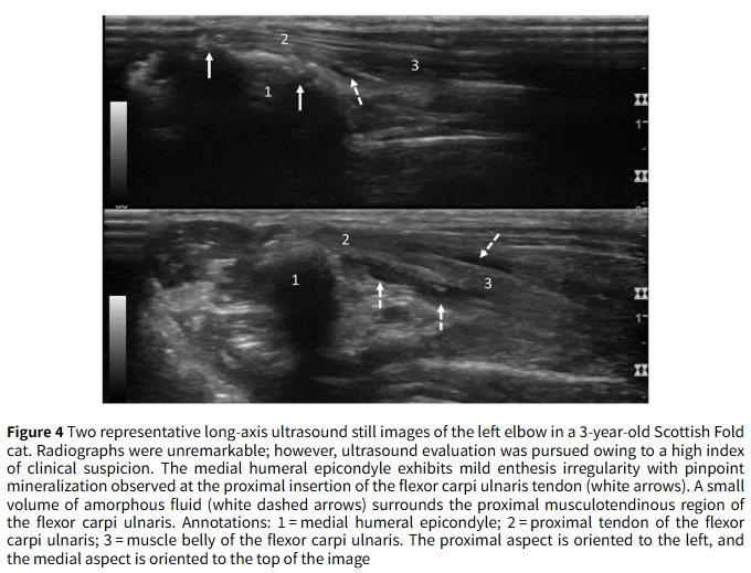 둘째, 팔꿈치 내측 상과 주변에서 딱딱한 구조물이 만져지는지 확인하는 촉진이 매우 중요한 진단 단서가 될 수 있음을 시사합니다. 이는 모든 앞다리 파행 고양이의 신체검사에서 반드시 포함되어야 할 항목입니다.