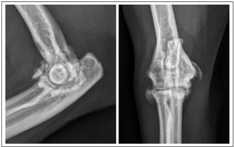 - 결과 1: 주요 임상 증상 및 새로운 발견 대부분의 고양이(8/9마리)는 특별한 외상 없이 서서히 시작되는 앞다리 파행을 주증상으로 내원했습니다. 정형외과 검사상 팔꿈치 관절 내측 상과 부위의 통증(15/17개 관절)이 특징적이었으며, 이전에는 보고되지 않았던 중요한 소견으로, 7개의 팔꿈치에서 내측 상과 원위부에 딱딱한 광물 침착이 촉진되었고, 이 중 6개는 촉진 시 통증을 유발했습니다.