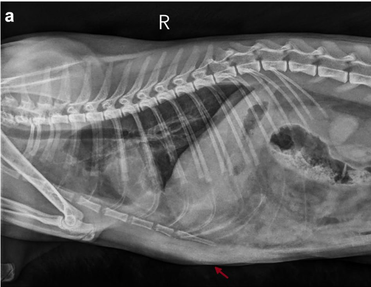옆구리 탈장(Paracostal hernia)은 복벽의 일부인 외복사근과 복횡근이 갈비뼈나 늑연골 부착부위에서 찢어지면서 복강 내 장기가 피하 공간으로 탈출하는 상태를 말합니다. 주로 교통사고나 다른 동물과의 싸움 등 외상으로 인해 복압이 급격히 상승하면서 발생합니다.