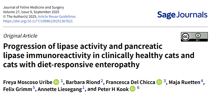 참고문헌 (Reference) Moscoso Uribe, F., Riond, B., Del Chicca, F., Ruetten, M., Grimm, F., Liesegang, A., & Kook, P. H. (2025). Progression of lipase activity and pancreatic lipase immunoreactivity in clinically healthy cats and cats with diet-responsive enteropathy. Journal of Feline Medicine and Surgery, 1-9.