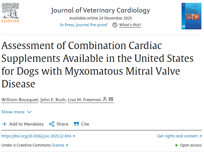 개에서 발생하는 이첨판 폐쇄부전증(MMVD)의 치료는 약물 투여와 식이 관리가 핵심입니다. 최근 반려동물 보조제 시장이 급격히 성장함에 따라 심장 건강을 표방하는 수많은 '개 복합 심장 보조제(CCC)'가 출시되고 있습니다. 하지만 이러한 제품들은 인간용 보조제보다 규제가 약하며, 성분 구성이나 용량에 대한 구체적인 정보가 부족한 경우가 많습니다. 특히 여러 성분이 혼합된 복합 보조제는 심장 약물과 상호작용을 일으킬 위험이 있음에도 불구하고, 이에 대한 객관적인 분석이 이루어지지 않아 임상 수의사와 보호자들이 제품을 선택하고 권장하는 데 어려움을 겪고 있었습니다.