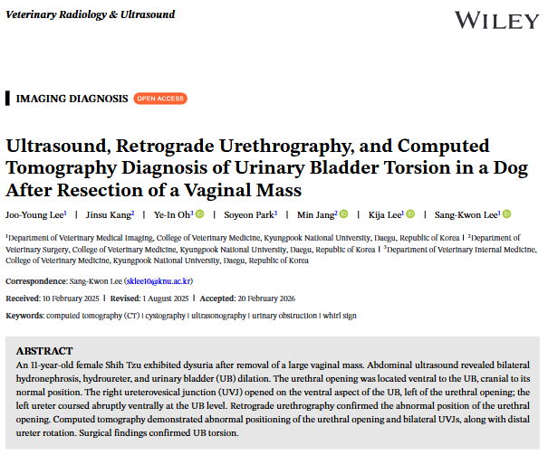 [참고문헌 (Reference)] Joo-Young Lee, Jinsu Kang, Ye-In Oh, Soyeon Park, Min Jang, Kija Lee, Sang-Kwon Lee. (2026). Ultrasound, Retrograde Urethrography, and Computed Tomography Diagnosis of Urinary Bladder Torsion in a Dog After Resection of a Vaginal Mass. Veterinary Radiology & Ultrasound, 67, e70151.
