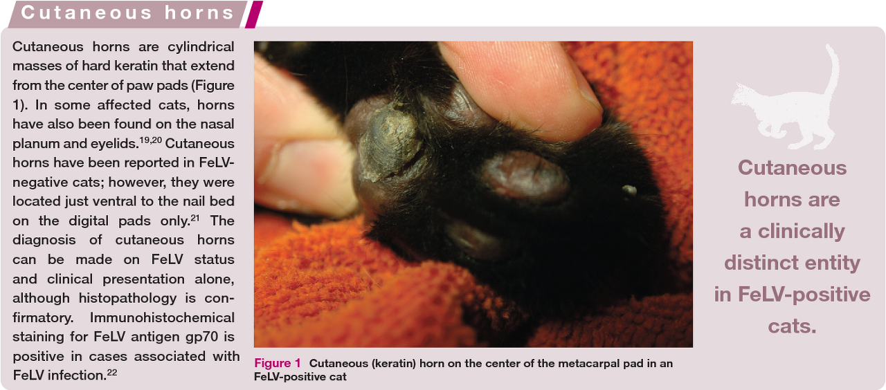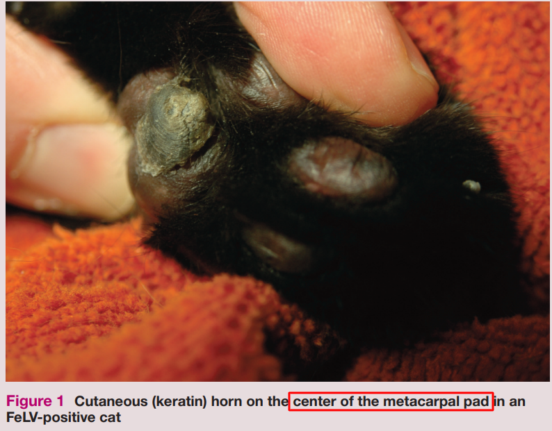 * FeLV의 경우 metacarpal or metatarsal 패드의 중심부에서 뿔이 형성되는 특징 (100%는 아니다)