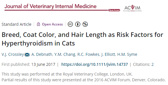 고양이 품종, 털색, 털길이에 따른 갑상선 기능항진증과의 상관관계