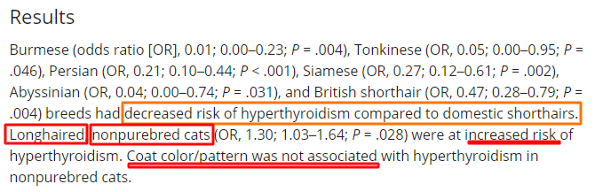 버마고양이, 톤키즈, 페르시안, 샴, 아비시니안, 브리티시숏헤어에서 갑상선기능항진증 발생가능성이 낮아 지고