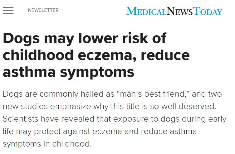 어린 아이들이 신생아 시기에 강아지와 접촉을 했을때 습진과 천식증상의 발현이 감소한다는 자료.