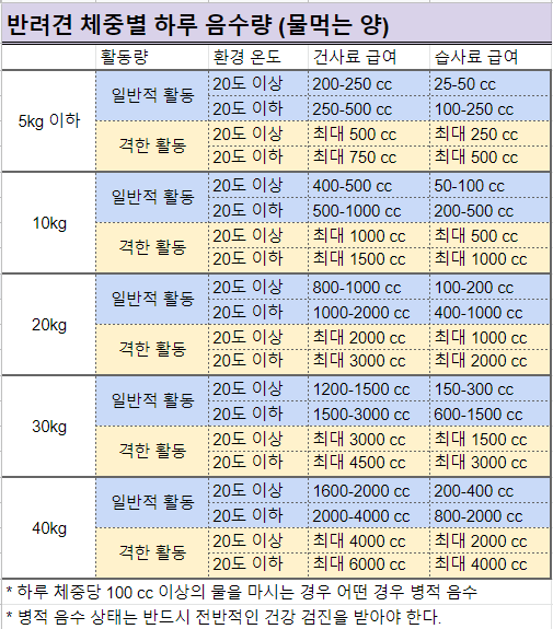 반려견 체중별 하루 음수량 (물마시는 양)