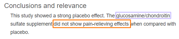 자본주의 마케팅으로 글루코사민과 콘드로이친이 관절염에 좋다고 하지만 실상은 전혀 효과가 없는 것이 증명됨.