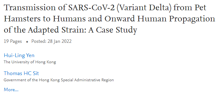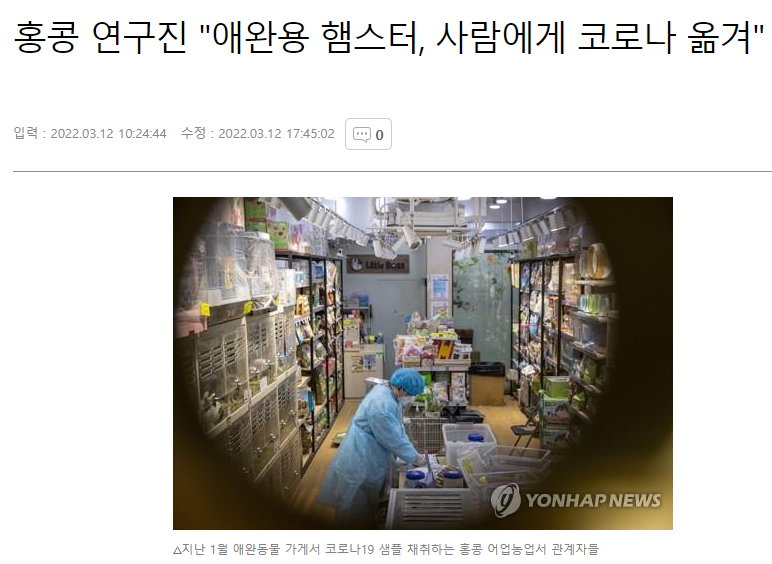 홍콩에서 사람에게 햄스터가 코비드19 즉, 코로나19를 전파시킨 사례라고 보고되었다.