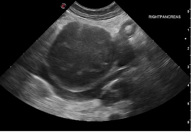 이 증례의 경우 췌장부에 종괴성의 병변이 있어 종양을 감별하기 위해 초음파 유도하에 세포 검사를 진행하였고
