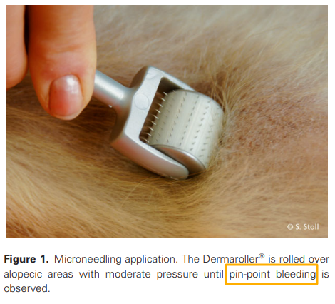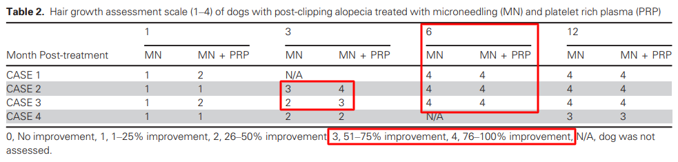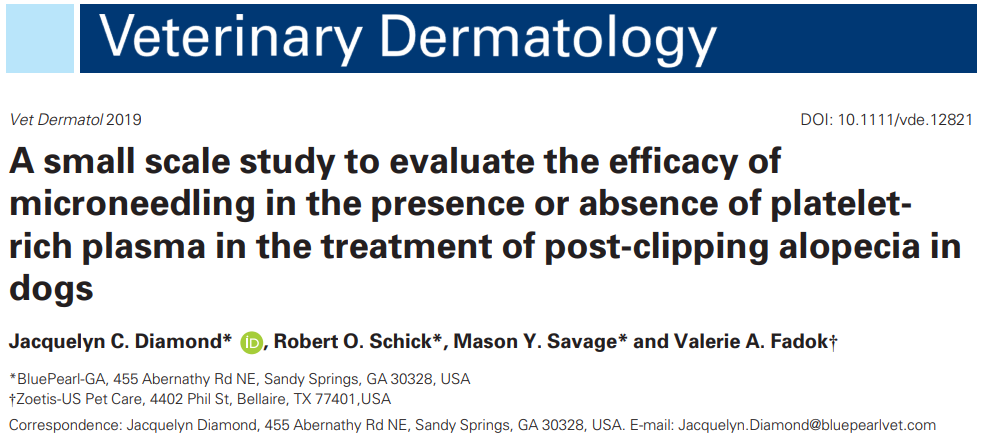 소위 post clipping alopecia가 발생한 개에서 이를 치료하기 위한 치료법중 마이크로니들링을 적용함에 있어 혈소판충만혈청을 적용한것과 적용하지 않는것의 차이에 대한 논문.
