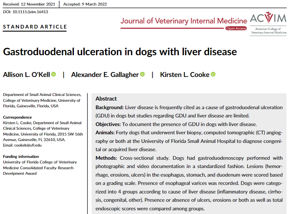 간 질환이 있는 개의 10%에서 위,십이지장 궤양이 발견되었다는 것.