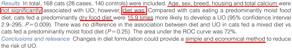 오직 사료의 성상 즉, 습사료와 건사료간의 차이에서 건사료를 먹는 경우 요도 폐색의 발생율이 16배 가까히 증가한다는 논문