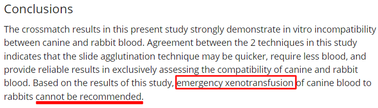 결국 현재까지 토끼의 수혈은 토끼간에만 해야 한다는 말이다.