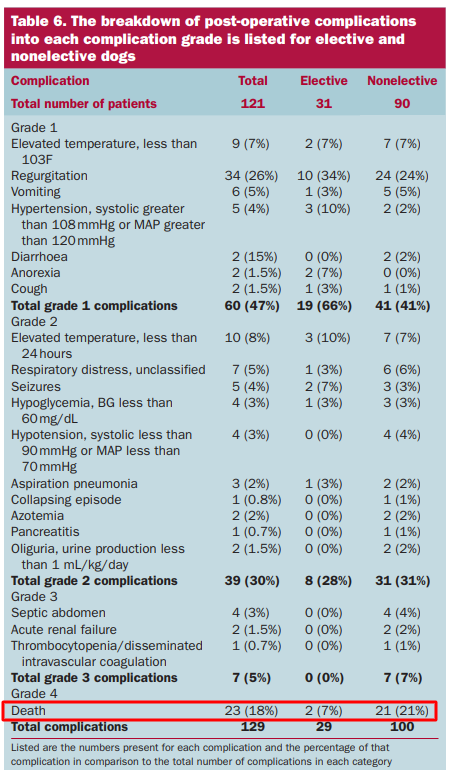 즉, 증상이 존재하기 시작한 후에 수술을 하면 사망률이 증가하여 5마리중 1마리가 사망하는꼴로 보아야 한다.