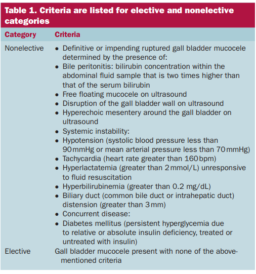 | - 담낭 파열이 존재하거나 파열 가능성이 높은 경우 - 담즙성복막염 : 복수 샘플의 빌리루빈 수치가 혈중보다 2배 이상인 경우 - 복강내 점액종이 관찰되는 경우 - 담낭파열이 초음파상 관찰되는경우 - 담낭주변의 복막 에코상 상승되어 관찰되는 경우 - 전신 증상이 다음과 같은경우 - 저혈압이 관찰되는경우 - 수축기 혈압이 90mmHg이하, 평균혈압이 70mmHg 이하인경우 - 빈맥이 관찰되는 경우 - 분당 160회 이상 - 혈중 락테이트 수치가 증가한 경우 - 2mmol/L 이상이며 수액처치로 개선되지 않을때 - 고빌리루빈혈증 - 0.2mg/dL - 담도확장이 관찰되는 경우 - 3mm 이상 - 기저질환이 있는 경우 - 당뇨병 |