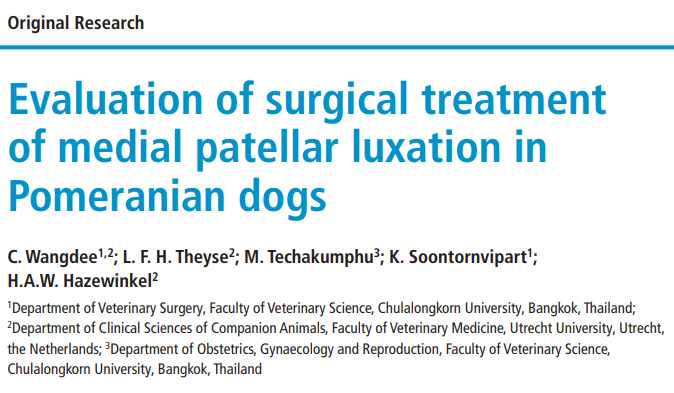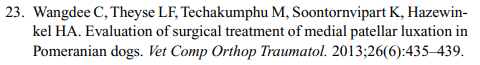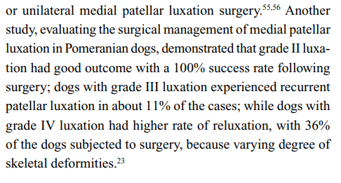 슬개골 탈구 수술을 했을때 다리저는게 사라지는 성공율과 그 이후 10년동안 추적했을때 재발하는 비율을 조사한 논문이다. 미국 플로리다 주립대학의 의료기록을 분석하여 쓴 논문이라 시대