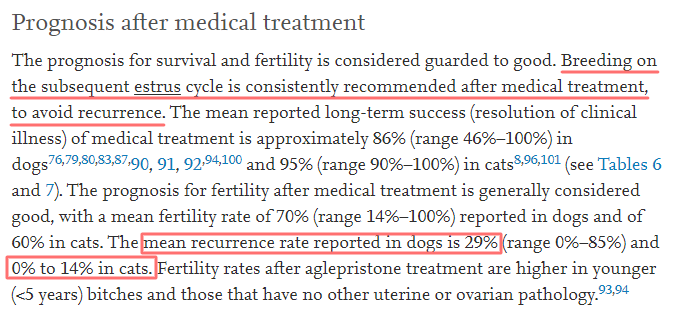 내과적 치료의 예후 부분에서 재발을 막기 위해 매 발정시마다 지속적으로 임신을 시키는것이 예방의 방법이라고 언급하고 있다.