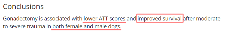 교통사고뿐 아니라 심각한 수준의 외상이 있는 환자에서 암컷이건 수컷이건간에 중성화 수술을 한 반려견의 생존성이 더 높다는 논문이 이번에 나왔다.