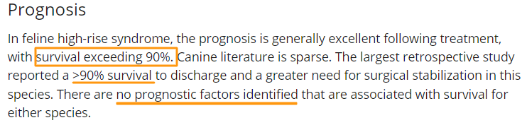 하지만 여기서 전재는 즉사하지 않고 병원에 이송되었을때까지 살아있는 고양이, 그리고 공격적인 치료를 개시한 고양이에 한해 90%의 생존율을 보인다는것이지
