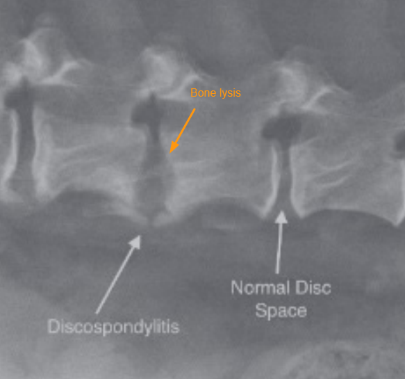 이때문에 상행성 감염이 유발되는 경우 골염이 동시에 발생할 수 있어 이런 경우를 두고 discospondylitis 라고 부른다.