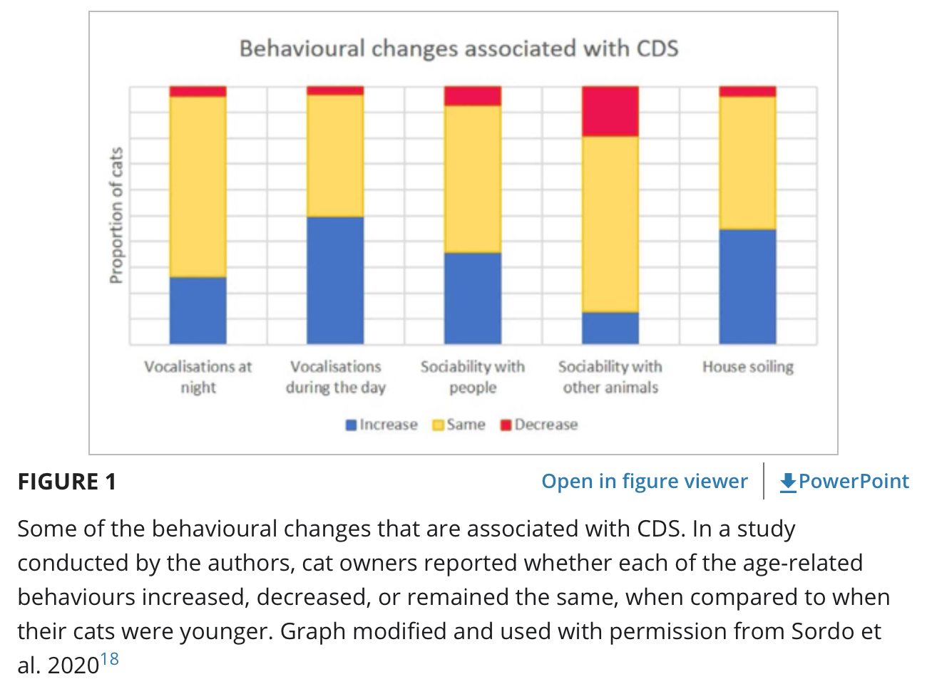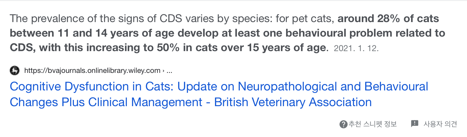 고양이의 경우 11~14년령에서 28%가 치매와 관련한 행동장애를 보이며