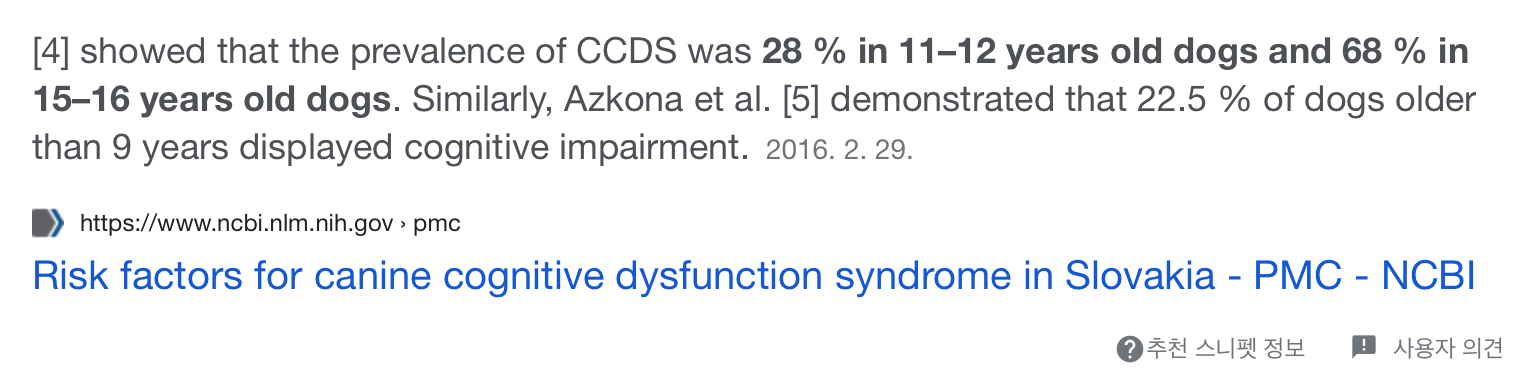 반려견의 경우 11~12세에 전체 28% 정도가 치매 유병율을 보이며