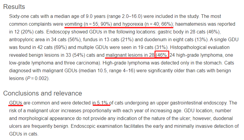 다시말해 구토를 해서 내시경을 한 환자 100마리 중에 3마리는 악성병변을 가지고 있어 이중 대부분은 악성종양 환자였다는것을 의미한다.
