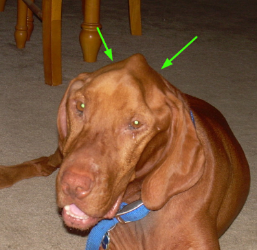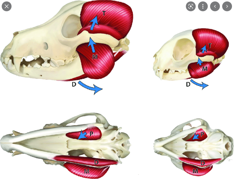 주로 임상적으로 눈에 잘 띄는 근육은 측두근으로 (T ; temporalis m.) 편측으로 위축이 일어나면 아래의 로트와일러처럼 된다.