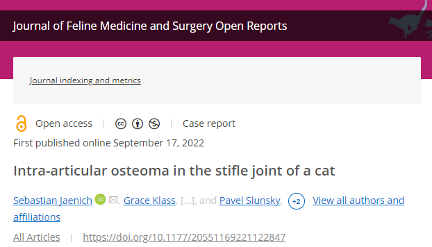 고양이 무릎 관절낭 내부에 양성 골종양이 생긴 증례이다.