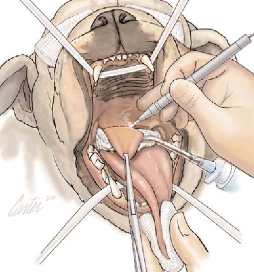 불독이나 프랜치불독, 시츄, 퍼그, 페키니즈 등에서 호발하는 연구개 노장은 주로 호흡 부전에 의한 급사 증후군의 주요 원인이다.