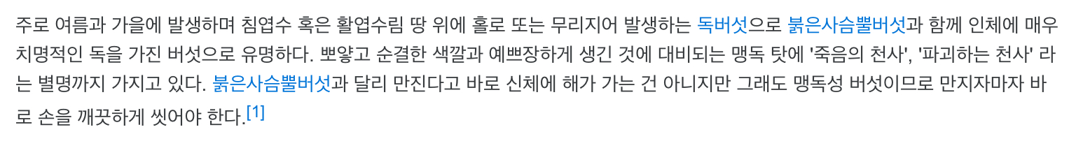 도심지에서도 공원등에서 자생되어 관찰될 수 있고 외견상 식용 버섯과 유사한 그리 화려하지 않는 모습의 버섯이기 때문에 실수로 먹는 사람이 있을 수도 있다.