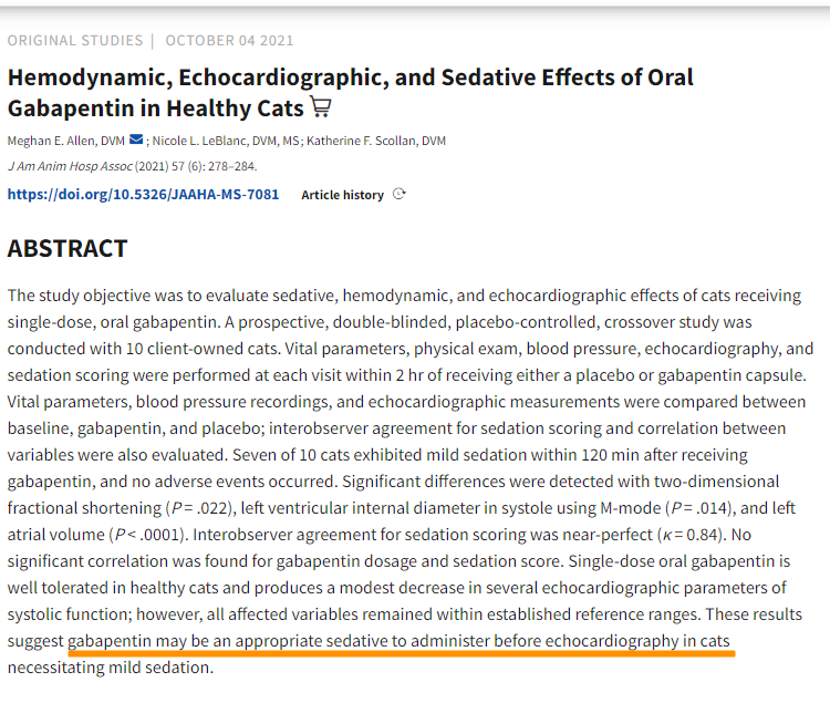 성격소심하여 동물병원에 오면 엄청난 스트레스를 받아 심장이 둠짓둠짓 하는 고양이의 경우 집에서 안정을 목적으로 가바펜틴을 처방하기도 하는데 이것으로 인한 심혈관계 변화가 오진의 빌미가 될 수 있지 않는가? 라는 물음에서 시작된 논문이라고 보면 된다.